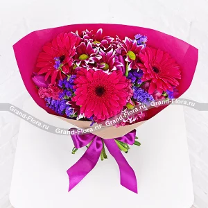 Полнолуние - букет с розовыми гвоздиками и эустомой