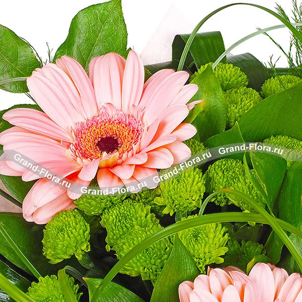 Если ваше сердце околдовано пылкими чувствами, самое время приобрести нежный цветочный букет, чтобы еще раз полюбоваться улыбкой избранницы сердца. Превосходное сочетание нежных герберов, томных зеленых хризантем и зеленого декора делают букет изысканным и романтичным. Такой чудесный презент повернет ваши чувства в новое русло, добавит ярких эмоций и оставит приятный след в мыслях девушки.
