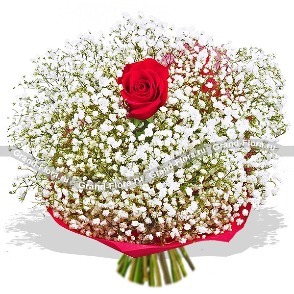 Уменьшенный: роза красная - 1 шт, гипсофила - 3 шт, фетр розовый. Примерный диаметр  букета 20х20 см.