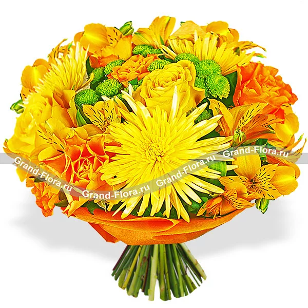 ДЕЛЮКС: хризантема одноголовая желтая - 7 шт., роза оранжевая - 5 шт., роза желтая - 4 шт., альстромерия оранжевая - 7 шт., хризантема кустовая зеленая - 7 шт., фетр оранжевый. Примерный диаметр букета 50х50 см.