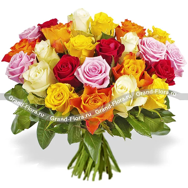 Роза ассорти (желтые+красные+оранжевые+белые+розовые),50/60 см, упаковка, лента. На фото представлен букет из 29 роз.