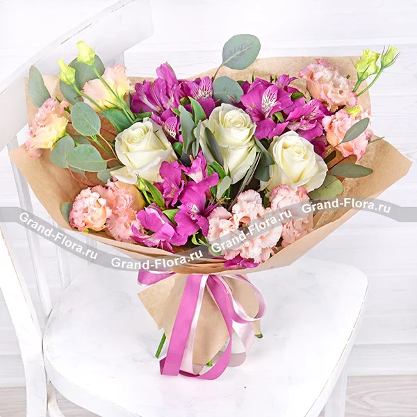 Роза белая- 5 шт., эустома розовая – 5 шт., альстромерия фиолетовая/розовая – 5 шт., декоративная зелень (эвкалипт) – 3 шт., упаковка, лента.